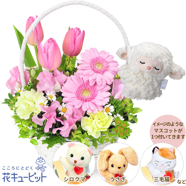 ピンクのチューリップやガーベラをぎゅっと詰めたバスケットに、動物のマスコットを添えたアレンジメント。マスコットは、パンダ・三毛猫・うさぎなどの豊富なラインナップから1つお付けいたします。どのマスコットが届くかはお楽しみ!