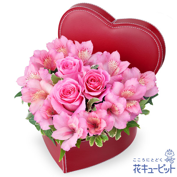 「気配り」という花言葉を持ったピンクアルストロメリアと、「感謝」という花言葉を持ったピンクバラを、ハートボックスに入れてお届け。いつも優しいあの人へのプレゼントに最適です。ハートボックスは小物入れにもなりますよ。