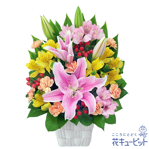 上品で存在感のあるピンクのユリと、黄色のアルストロメリアをあわせたアレンジメント。高さ40cmとボリュームがあるため、フォーマルなお祝いのシーンに最適なプレゼントです。開店祝いや移転祝いのギフトとしてお贈りください。