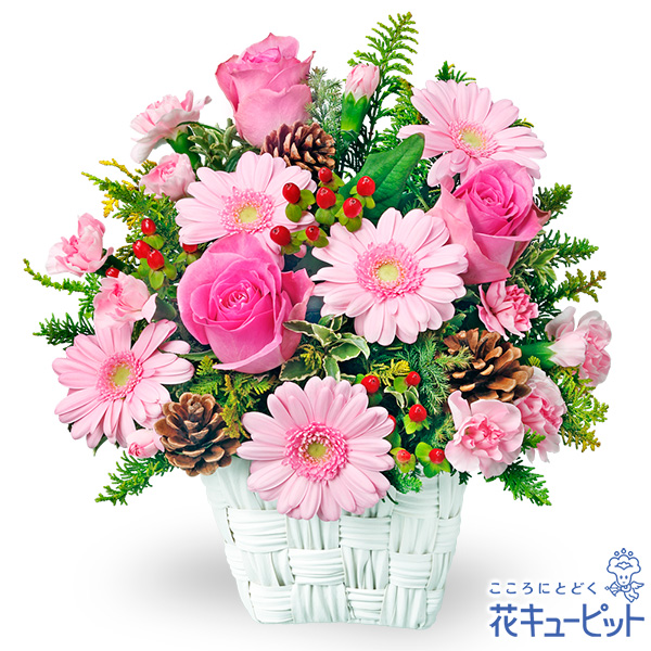 可憐なピンク色でまとめた、ボリュームたっぷりな冬のアレンジメントです。華やかなバラとガーベラで、お祝いのシーンが明るい雰囲気に包まれます。