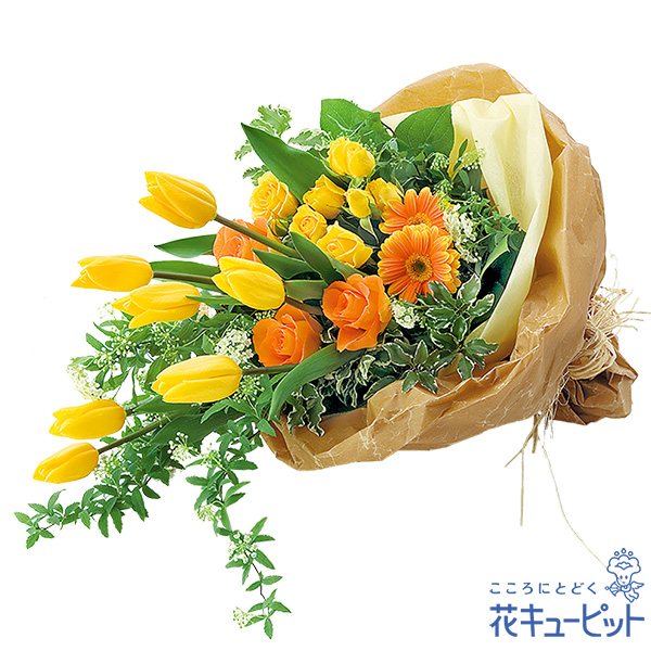 黄色とオレンジを基調にして、温かみのある色合いに仕上げた花束です。伸びやかなチューリップを中心に、ガーベラなどの人気な花を束ねました。爽やかな雰囲気のギフトなので、男性・女性を問わずに喜ばれるプレゼントです。