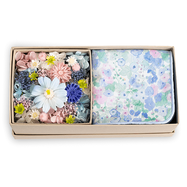 淡い水色とピンクの花々をぎゅっと詰め込んだフラワーボックスと、水彩で描かれたソフトな色調のリバティプリントが目を惹くタオルハンカチのセット。ハンカチは日常使いしやすいコンパクトなサイズ感です。プリザーブドフラワーは、生花に保存加工を施した長く楽しめるギフトです。通常の生花よりも長い間飾っておくことができるので、お部屋のインテリアとしても人気があります。水やりなどのこまめなお世話がいらないため、忙しいお母さんへのプレゼントにもぴったり。母の日のフラワーギフトをなるべく長く形に残しておきたい方におすすめです。【ドライフラワー:カップフラワー、スターフラワー、イモーテル】【資材:ボックス】【※この商品は、離島などの一部の地域へのお届けは出来ません】