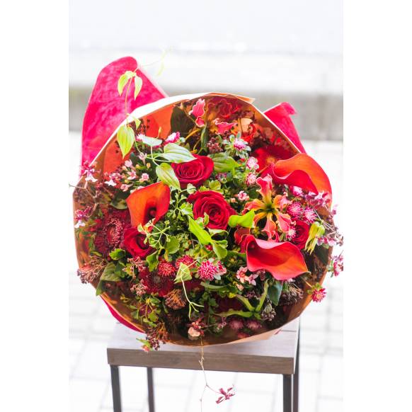 【画像送信サービスもOK】お届けするお花の商品画像をメールで送信致します。レッド系中心の上品なアレンジメント。きっと誰もが「赤い糸」で結ばれている。「絆の強さ」と「情熱」を表す男性から女性へ贈るにピッタリな赤系のフラワーギフトです。【即日発送→翌日届けご希望の場合お電話にて承ります】TEL.055-987-0575