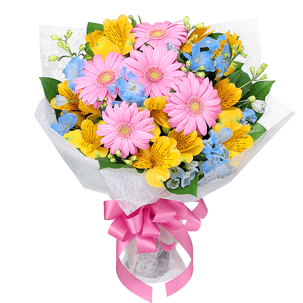 卒業祝い・入学祝い・就職祝いに贈りたい、カラフルで春らしい花束。「常に前進」という前向きな花言葉を持つガーベラを中心に、ピンク・黄色・水色の3色でまとめたギフトです。これまでの頑張りに賛辞を送る気持ちと、これからの新生活を応援する気持ちを込めてプレゼントしてください。